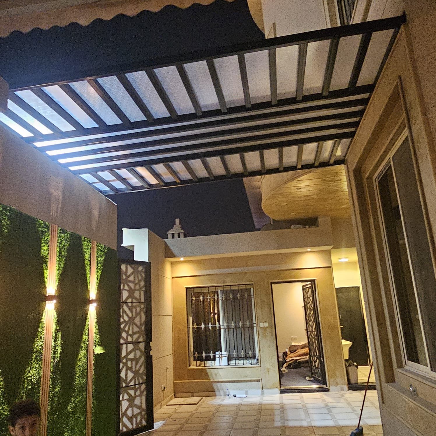 بالإضافة إلى جمال الشكل، يمكن تركيب إضاءة داخل البرجولا لتوفير أجواء دافئة ليلية، مما يجعل الجلسة ممتعة على مدار اليوم.