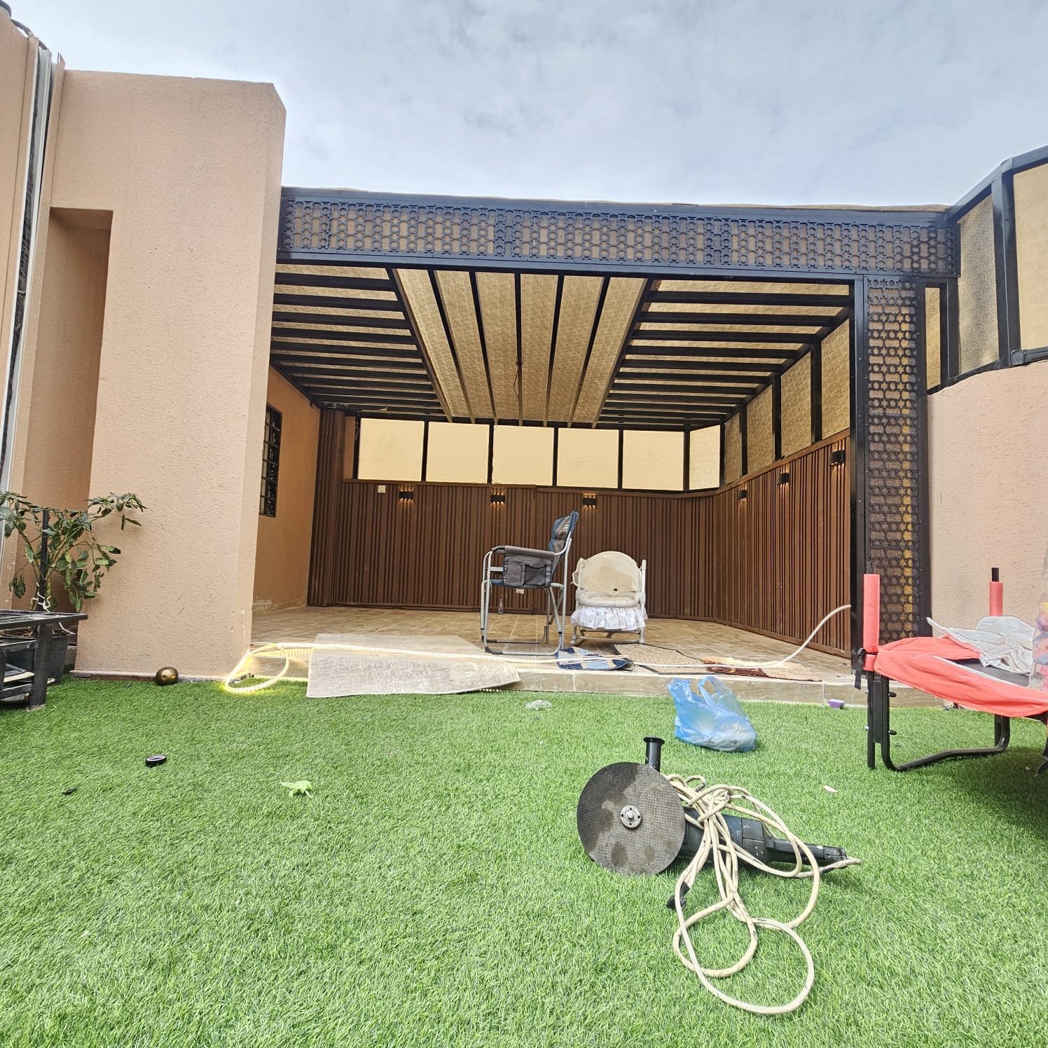 بالإضافة إلى جمال الشكل، يمكن تركيب إضاءة داخل البرجولا لتوفير أجواء دافئة ليلية، مما يجعل الجلسة ممتعة على مدار اليوم.